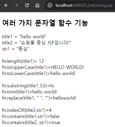- 자바에서 문자열을 처리할 때 사용하는 문자열 관련 기능을 JSTL에서 제공하는 함수를 이용해