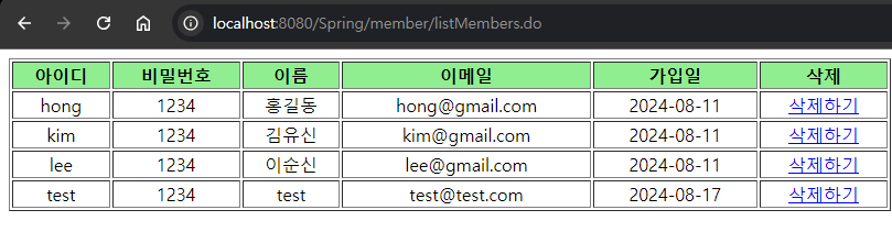- 코드 작성 후 /member/listmembers.do 로 접근해 회원 정보 리스트가 출력되는지 확인한다.