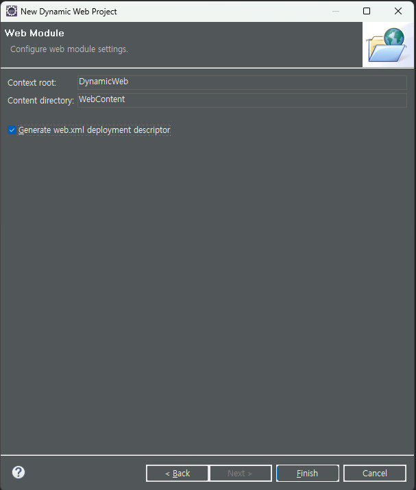 - 생성 마지막 단계에서 [Generate web.xml deployment descriptor] 에 체크하고 [Finish] 버튼을 클릭하여 프로젝트 생성