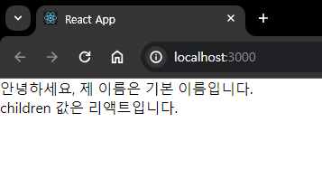 - 위 코드에서 MyComponent 태그 사이에 작성한 리액트라는 문자열을 MyComponent 내부에서 보여 주려면 props.children 값을 보여 주어야 한다.