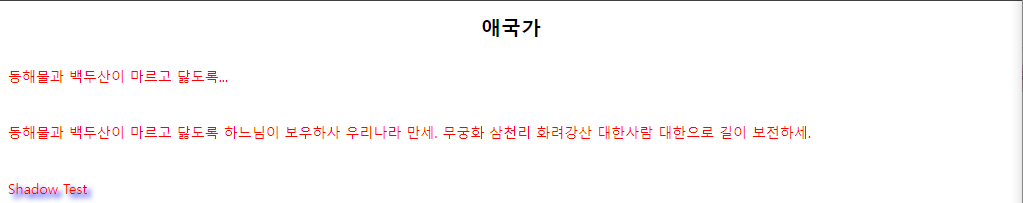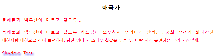 - text-shadow 속성을 이용하여 문자에 그림자를 적용할 수 있다. 이 속성은 다음 예와 같이 4가지 값을 가진다.