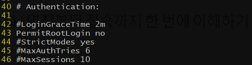 추가로 43번 째 줄인 "PermitRootLogin"을 "no"로 설정하여 root 계정으로 바로 ssh 접속이 불가능하도록 설정한다.