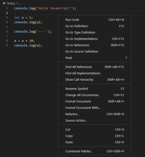 자바스크립트의 경우 코드를 실행하기 위해서 브라우저의 개발자 도구나 Node.js를 설치하여 터미널의 REPL을 이용하는 방법도 있지만, VS Code의 Code Runner를 이용해 간편하고 빠르게 자바스크립트의 코드를 실행해 볼 수 있다.