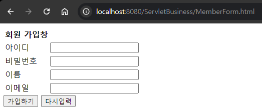 - 코드 작성 후 톰캣을 재시작하고 브라우저에 localhost:[port]/[project_name]/MemberForm.html 을 입력하여 회원 가입 페이지로 이동한다.