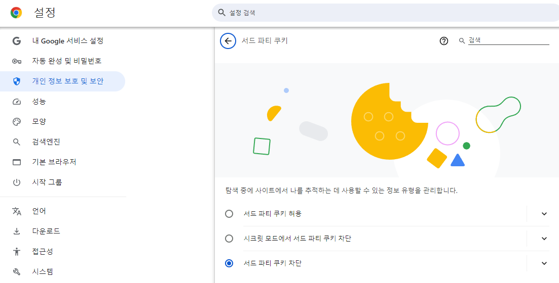 - 크롬의 경우 브라우저 [설정] 페이지에서 [개인 정보 보호 및 보안] - [서드 파티 쿠키] 페이지를 보면 "서드 파티 쿠키 차단" 옵션이 존재한다. 쿠키를 차단하는 경우 해당 옵션을 선택한다.