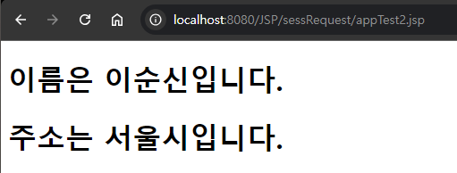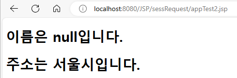 - 다른 브라우저에서 /appTest2.jsp 로 바로 접근하면 이름은 null로 출력될 것이다.