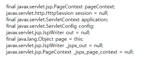 - JSP 페이지의 내장 객체(내장 변수)는 JSP가 서블릿으로 변활될 때 컨테이너가 자동으로 생성시키는 멤버 변수를