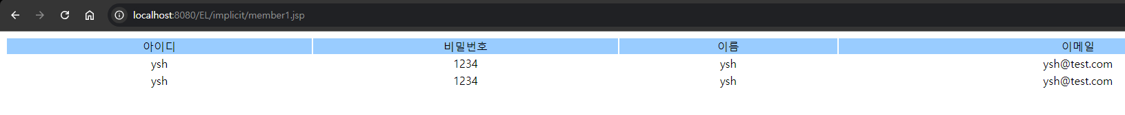 - 결과를 보면 정보가 두 번 출력된 것을 볼 수 있다. 첫 번째 회원 정보는 getParameter() 메서드로 가져온 후 출력한