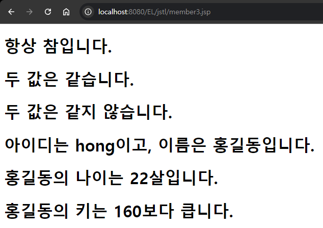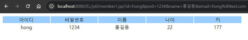 - /member7.jsp?id=hong&pwd=1234&name=홍길동&email=hong@test.com 과 같이 요청해 본다.