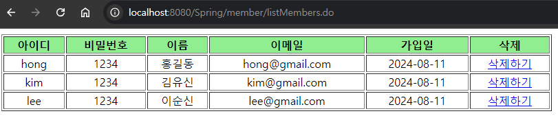 - 작성 후 /member/listMembers.do로 요청해 회원 정보 리스트가 출력되는지 확인한다.