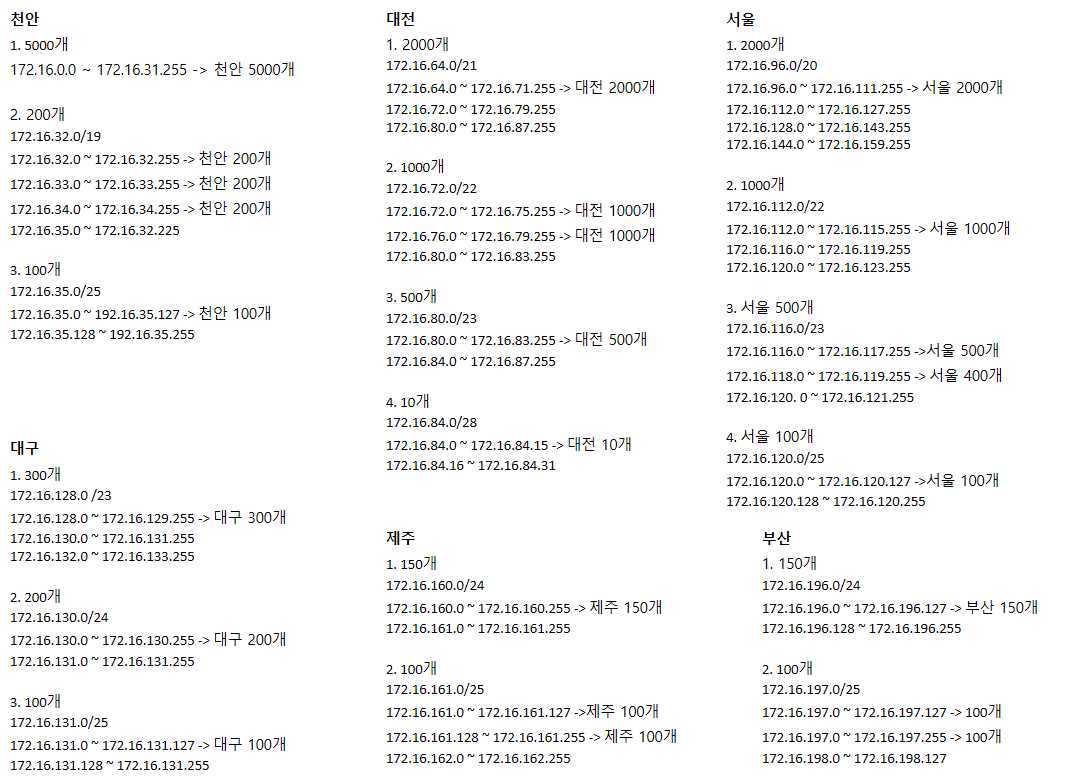 - 네트워크 구축 강의실 101호 ~ 104호까지 각 60개의 IP 필요