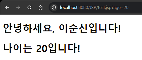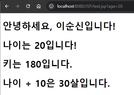 <h1>나이 + 10은 <%=Integer.parseInt(age)+10 %>살입니다.</h1>